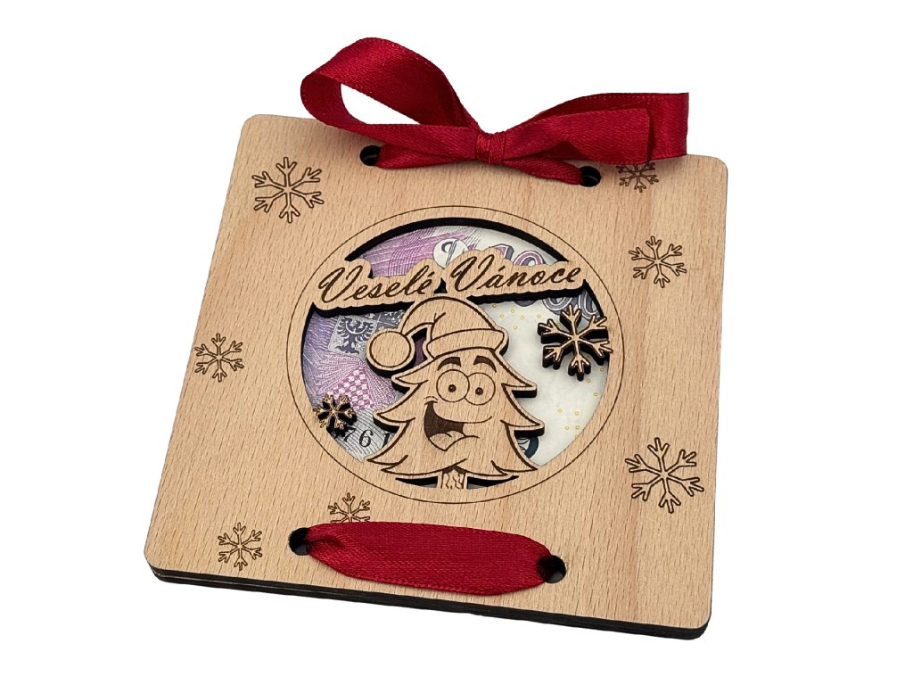 Originální dřevěná obálka na peníze s motivem "Veselé Vánoce - stromeček".