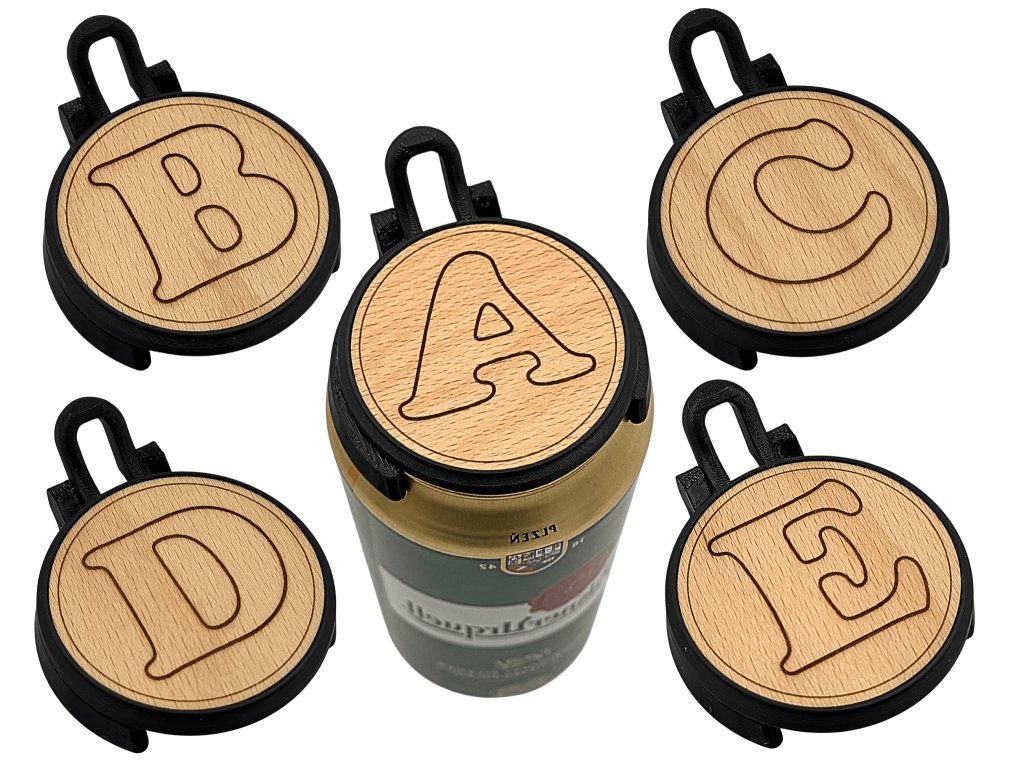 Víčka jsou k dispozici se všemi písmeny abecedy, takže si můžete vybrat iniciálu svého jména, přezdívky nebo třeba oblíbeného slova. Spodní část je vyrobena z kvalitního plastu, vrchní část tvoří broušené bukové dřevo s precizním laserovým gravírováním. Víčko snadno pasuje na standardní plechovky 500 ml.